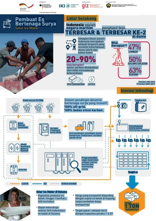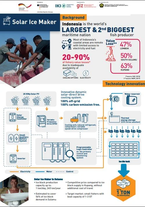 The development of Indonesia’s bioenergy potential database and dashboard, integrated into the publicly accessed MEMR One Map, helps enable the government and private sector in developing programs for more bioenergy project development. Through the development and implementation of the Biogas Plant Monitoring Application (M-Biogas), ExploRE successfully provides recommended actions to improve performance, enhance safety, and reduce potential malfunction risks in several biogas power plants. Through mapping support of biogas and biomass direct use in agroindustry for MEMR, ExploRE has contributed significantly to achieving the National Energy Mix Target by 93% and 85% of the 2023 and 2025 biomass utilization targets, respectively, as well as 23.07% and 14.02% of the 2023 and 2025 biogas utilization targets. ExploRE has actively contributed through technical assistance, studies, outreach, and private sector engagement, providing several recommendations for biomethane utilization as a strategic option for industry decarbonization and replacing fossil fuels. ExploRE has also been involved in providing recommendations for government counterparts (BAPPENAS, MEMR) for the development of a green hydrogen regulatory framework in Indonesia. ExploRE’s technical support in 11 biogas power plants, with a total capacity of 15.37 MW, and a solar-powered ice production site with a 25 kWp capacity, has contributed to mitigating at least 2.56 million tonnes of CO2 equivalent greenhouse gas emissions. The Solar Ice Maker pilot project in Sulamu, East Nusa Tenggara, commissioned in 2022, provides an environmentally friendly energy solution to stimulate economic growth in Indonesia’s remote and disadvantaged regions by integrating solar PV technology to power an ice-making machine, offering reliable cold chain access for local fishery industries.